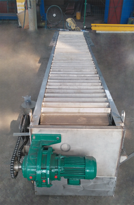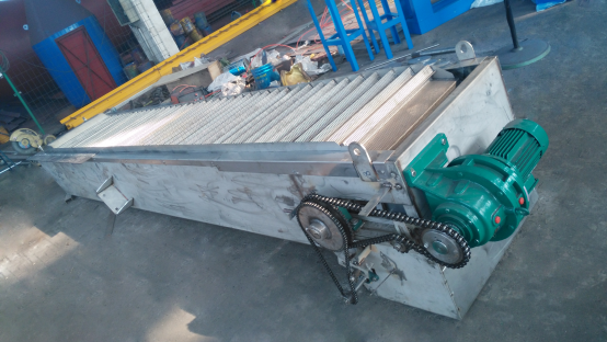 網板式階梯格柵機能清除漂浮物、纖維物質,運行時不堵塞雍水,能將柵渣清除干凈。主要由驅動裝置、機架、傳動鏈輪、牽引鏈條、網板及電氣控制柜等主要部件組成。工作時網板在二側傳動鏈條的帶動下,自下而上將整個渠道寬度范圍內的污物向上提取,抵達上部時,通過鏈輪的轉向功能,自動完成卸污工作。