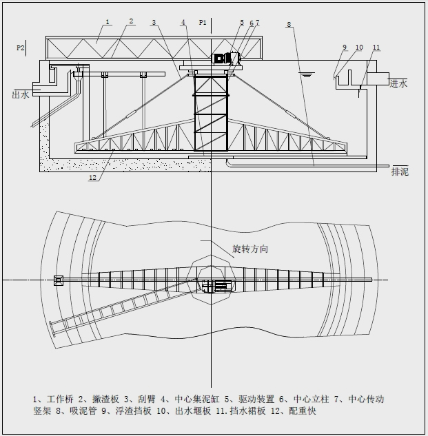 該設(shè)備采用中心傳動、垂架式,污水進入周邊配水槽內(nèi),經(jīng)槽底配水孔均勻流入池內(nèi),并在周邊擋水裙板的作用下,水流從池底流向中心,污泥依靠自重沉積于池底,從而形成泥水分離,驅(qū)動裝置驅(qū)動中心豎架旋轉(zhuǎn),并帶動刮臂及吸泥管旋轉(zhuǎn),在靜水壓力的作用下,污泥均勻地進入吸管上布置的吸口,然后通過中心排泥井的套筒閥排出池外。排泥量的大小可由套筒閥的升降度來控制,水面的浮渣通過撇清裝置撇向池邊,再由刮渣耙刮進排渣斗內(nèi)排出池外。